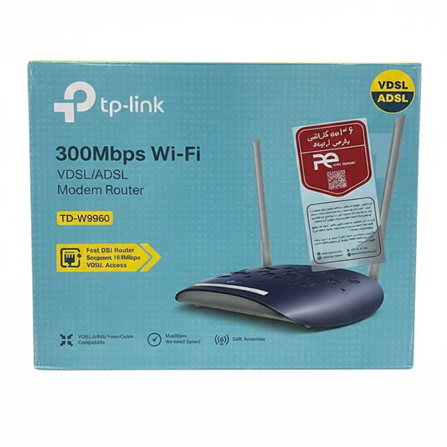 مودم روتر « TD-W9960 V1.20 » محصول شرکت نام آشنای «تیپی-لینک» (TP-Link)، اینترنت VDSL/ADSL را بهصورت بیسیم به اشتراک میگذارد و با بهرهوری بیشتر، قدرت و امنیت بالاتری ارائه میکند. این روتر فوقالعاده سریع و پرقدرت دارای 2 عدد آنتن خارجی قوی است. آنتنهای خارجی TD-W9960 V1.20 بسیار باکیفیت هستند و عملکرد بیسیم عالی با سیگنال پایدار در تمامی جهات و سرعت بالا در فواصل بیشتر را به ارمغان میآورد. فناوری VDSL2 سرعت پهن باند VDSL حداکثر 100 مگابیت در ثانیه ای را به طور همزمان برای آپلود و دانلود ارائه می دهد. پورت DSL تعبیه شده در دستگاه از تمام اتصالات استاندارد DSL پشتیبانی می کند و با اکثر ISP ها سازگاری دارد. مودم تی پی لینک TD-W9960 V1 با VDSL2, ADSL2+, ADSL2 و ADSL سازگاری دارد.این مودم تی پی لینک با سرعت وایرلس 300 مگابیت در ثانیه ای و با فرکانس باند 2.4 گیگاهرتزی و پورت های LAN چهار مگابیتی همراه است.. این محصول از شرکت تی پی-لینک بهراحتی و تنها در چند دقیقه تنظیم میشود؛ این کار با استفاده از اینترفیس وب بیس و اپلیکیشن موبایلی پرقدرت Tether امکانپذیر است؛ همچنین با نصب اپلیکیشن Tether روی دیوایسهای iOS و اندرویدی میتوان به تنظیماتی مانند میزان دسترسی و کنترل والدین دسترسی پیدا کرد. مودم روتر TD-W9960 V1 تیپی-لینک نگرانی شما را از بابت مشکلاتی که شاید از اتصال چند دستگاه به طور همزمان در یک شبکه چندرسانهای خانگی به وجود آید، از بین میبرد و بهراحتی در هر نقطه از خانه یا دفترکار بزرگ خود میتوانید به این دستگاه متصل شوید.